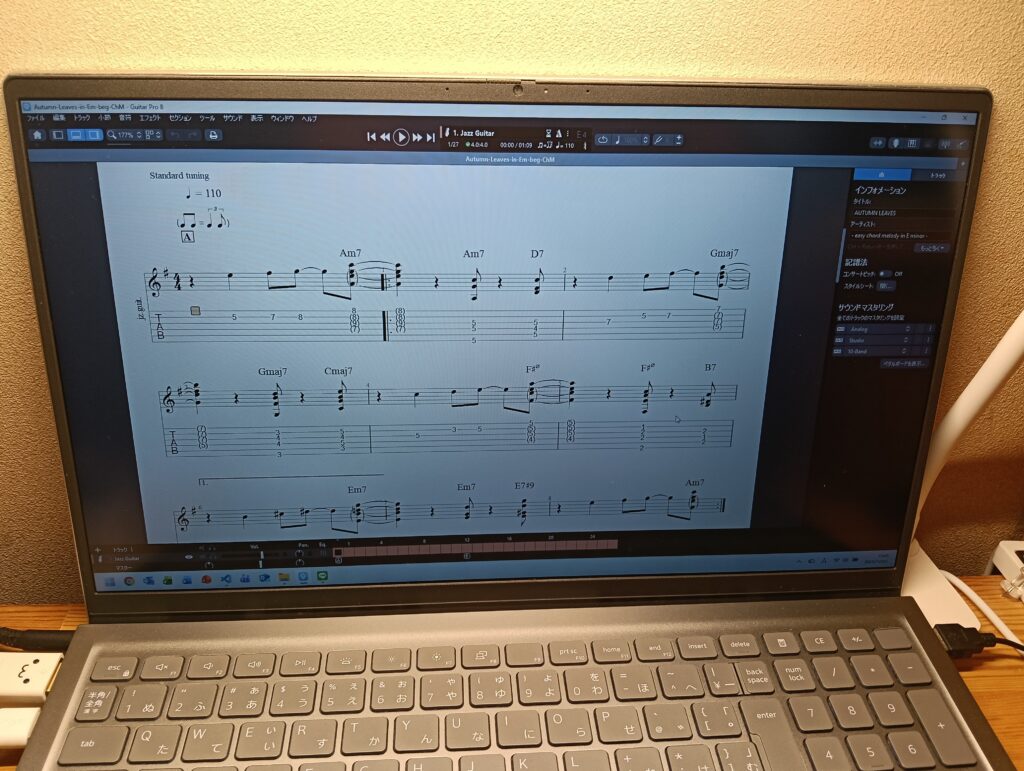 これに触発されて、昨晩、ウィーン在住のジャズギタリストが販売している初心者向けの教則コンテンツをポチった。ブラックフライデーの 30% オフで $58.5。中身は全 35 曲の TAB 譜、バックトラックの音源(MP3)、指導用の動画の URL 掲載の PDF の構成。TAB 譜は PDF と Guitar Pro 8 というソフトウエア(これも 30% オフでポチった $49)で作られた動的(音に合わせて楽譜が移動)なものの 2 種類。
